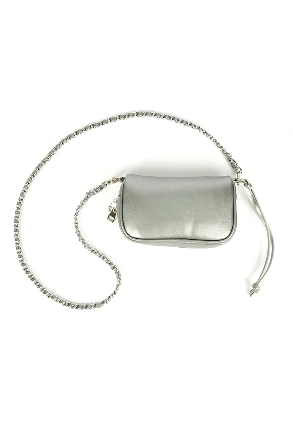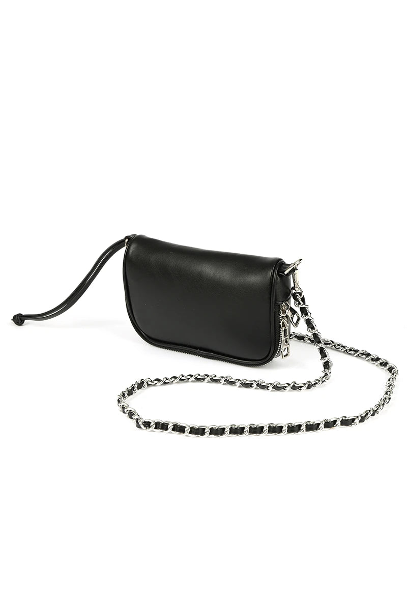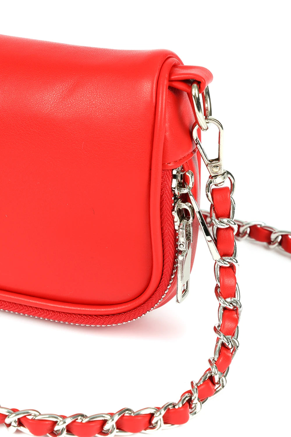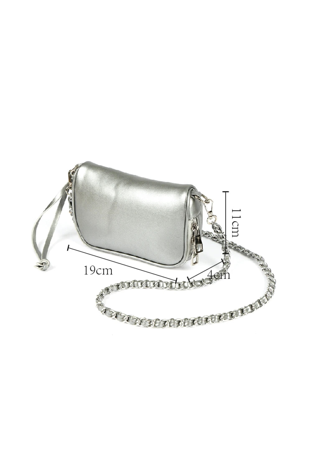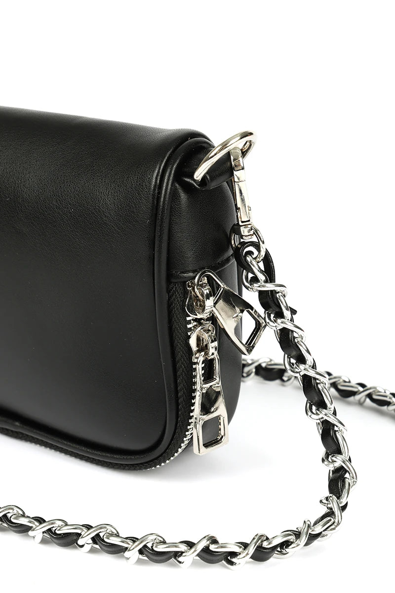 Bandolera compacta con correa larga tipo cadena entrelazada (metal + tiras de simil cuero) y muñequera desmontable para llevar en la mano. Exterior en simil cuero liso, cierre superior y herrajes metálicos. Interior forrado con bolsillo para organizar lo básico (celular, llaves, mini billetera, gloss). Liviana, cómoda y con toque urbano-chic para día o noche.