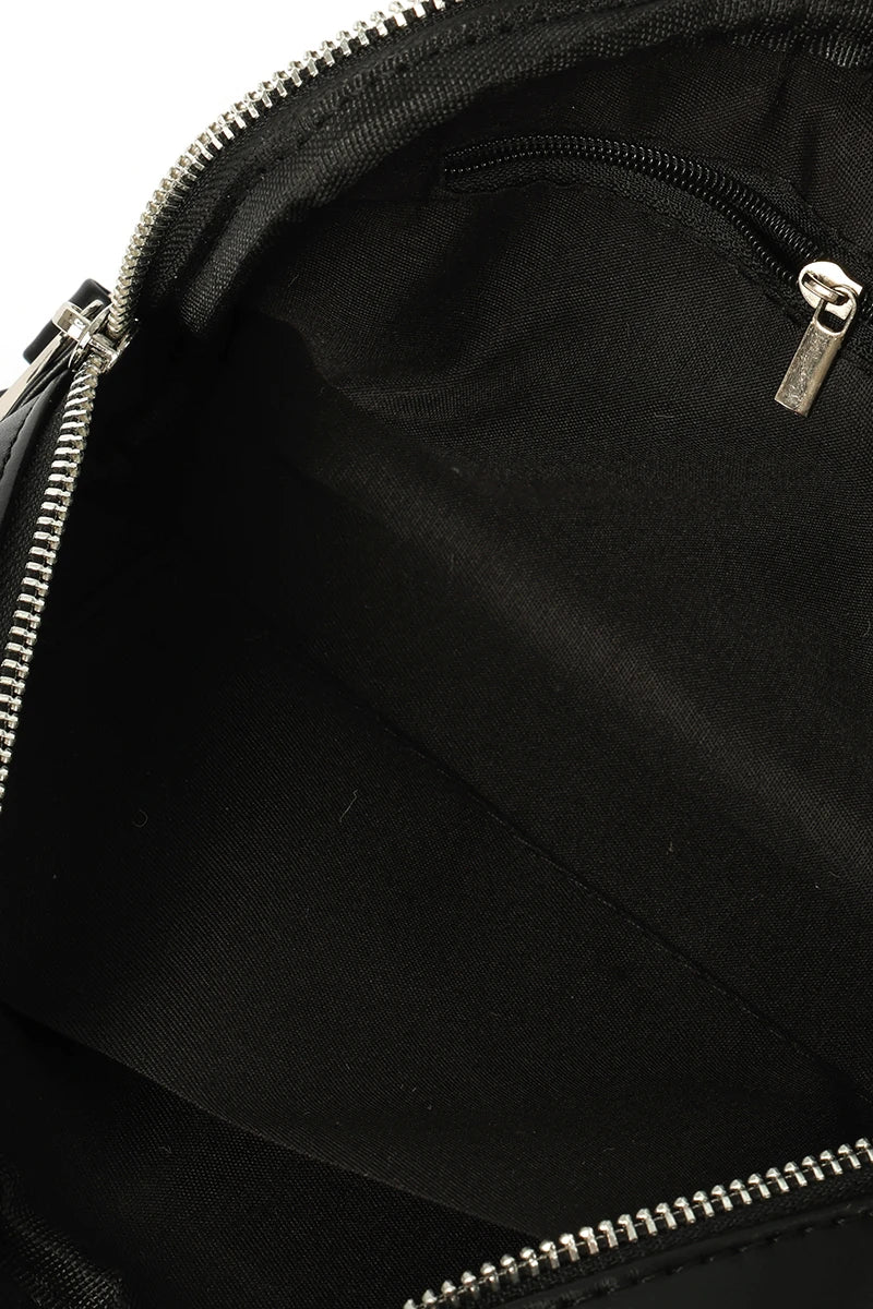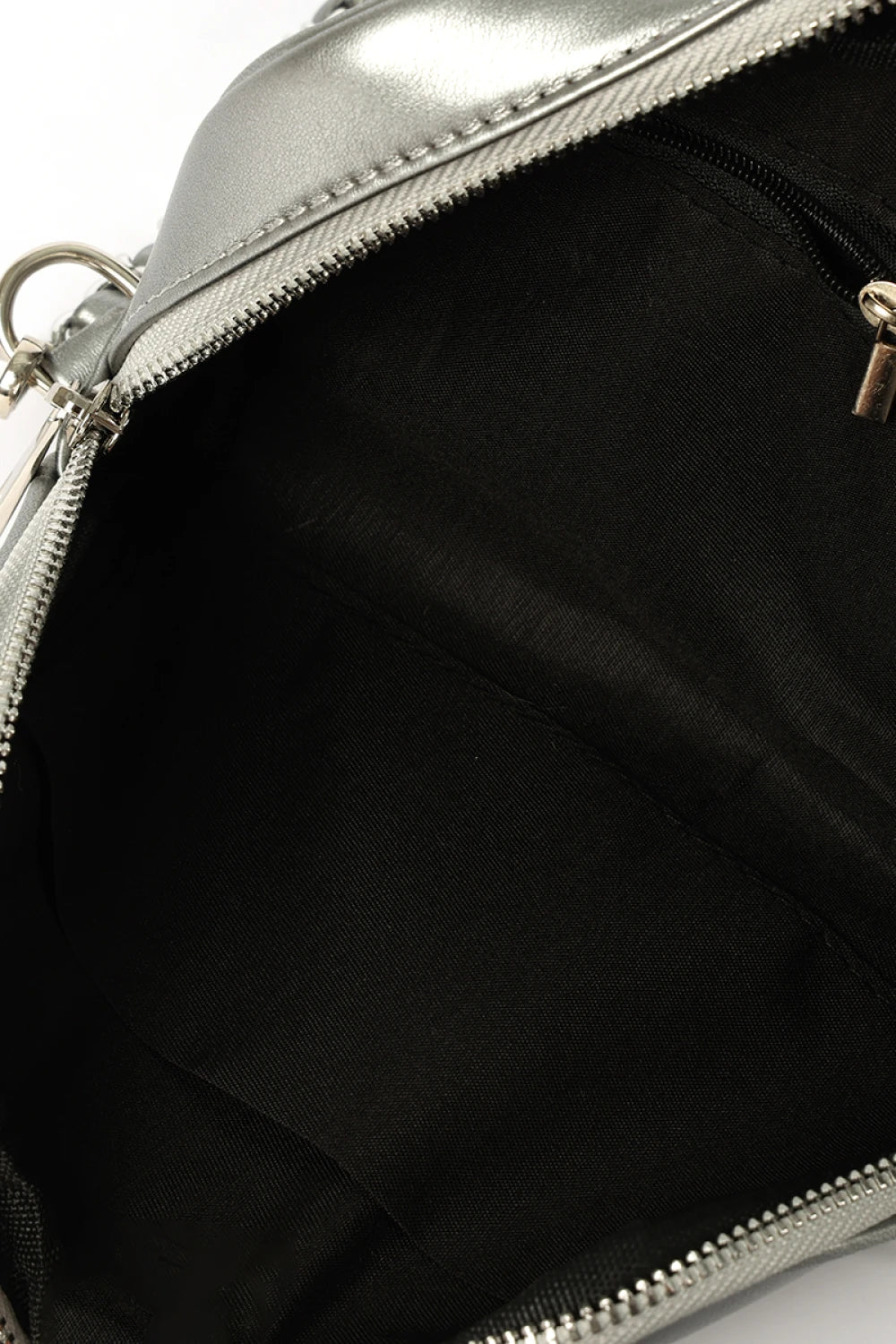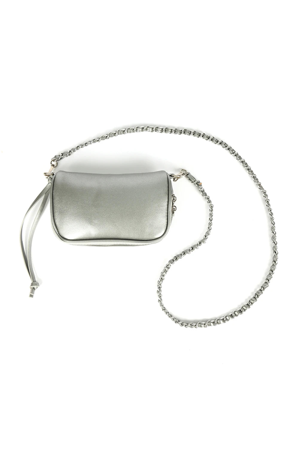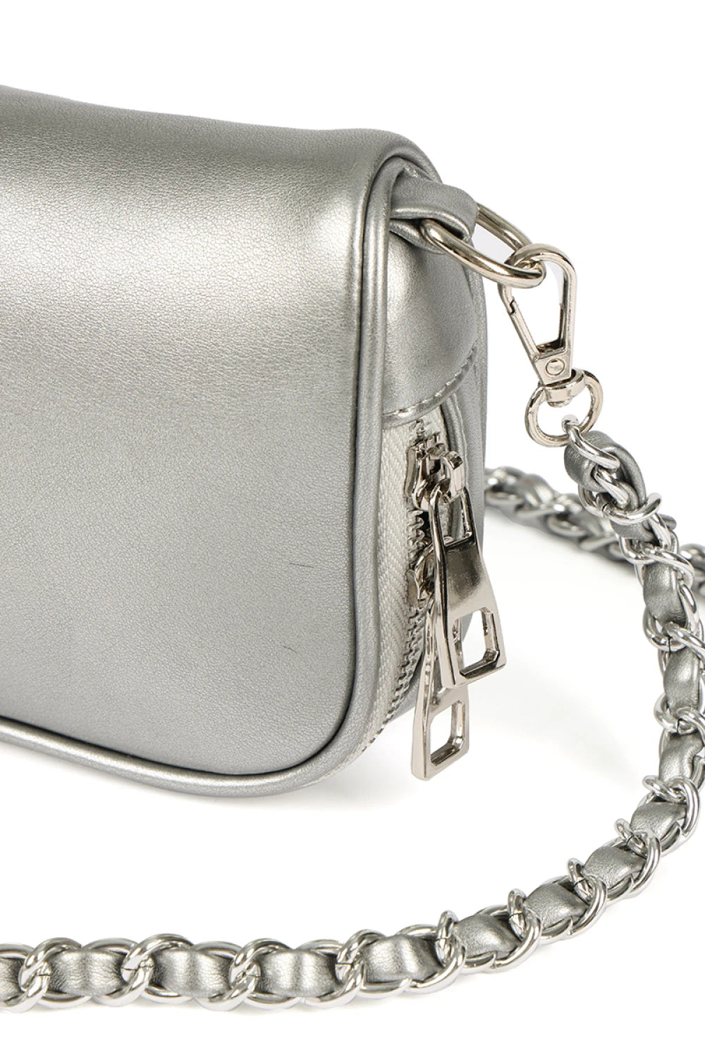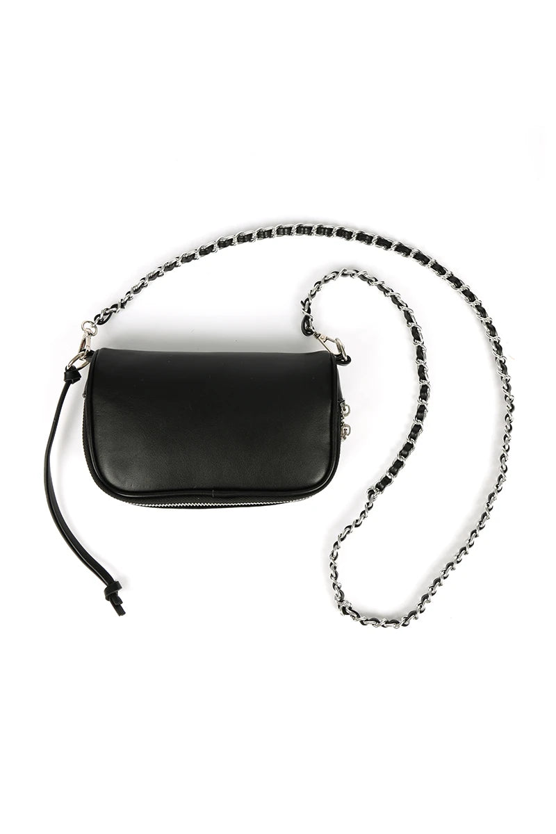 Bandolera compacta con correa larga tipo cadena entrelazada (metal + tiras de simil cuero) y muñequera desmontable para llevar en la mano. Exterior en simil cuero liso, cierre superior y herrajes metálicos. Interior forrado con bolsillo para organizar lo básico (celular, llaves, mini billetera, gloss). Liviana, cómoda y con toque urbano-chic para día o noche.