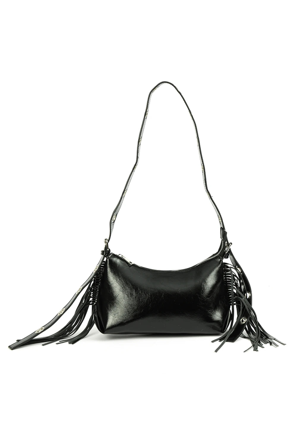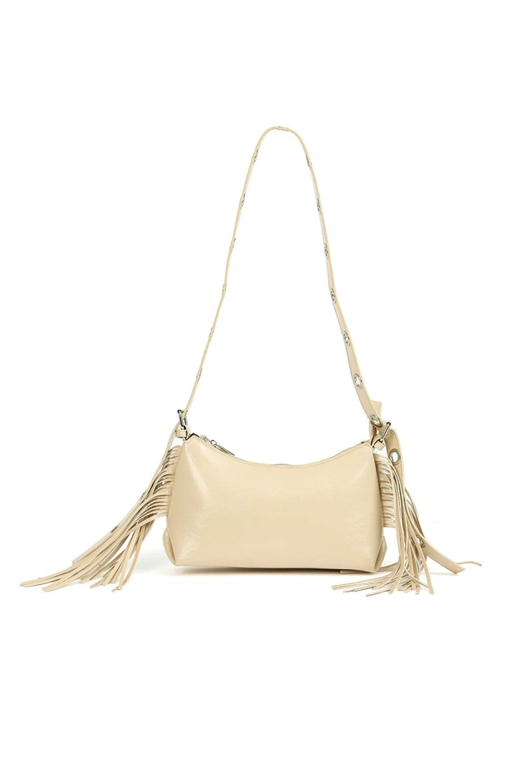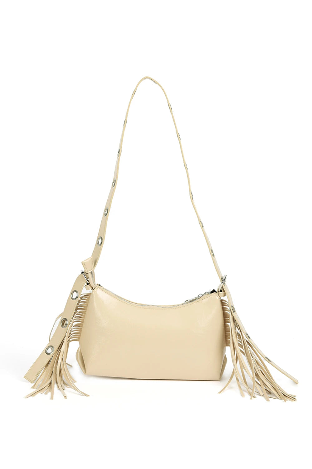 Baguette de diseño con flecos laterales y correa con ojalillos que suma actitud a cualquier look. Formato compacto pero rendidor: entra celular, billetera pequeña, llaves y make-up básico. Exterior en simil cuero fácil de limpiar, cierre superior con deslizamiento suave y forrería textil. Herrajes metálicos, costuras reforzadas y caída suave que estiliza al llevarla al hombro.
