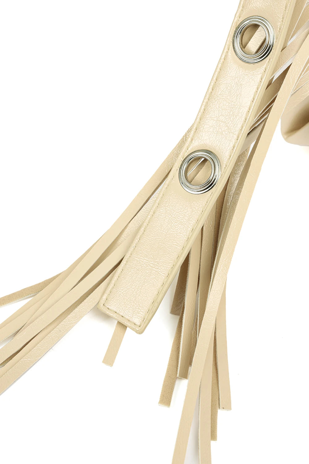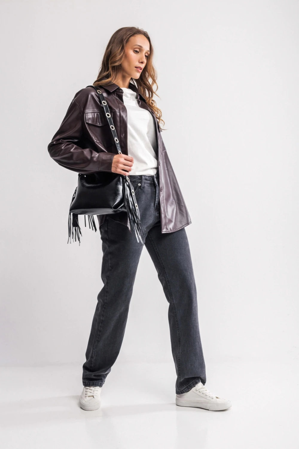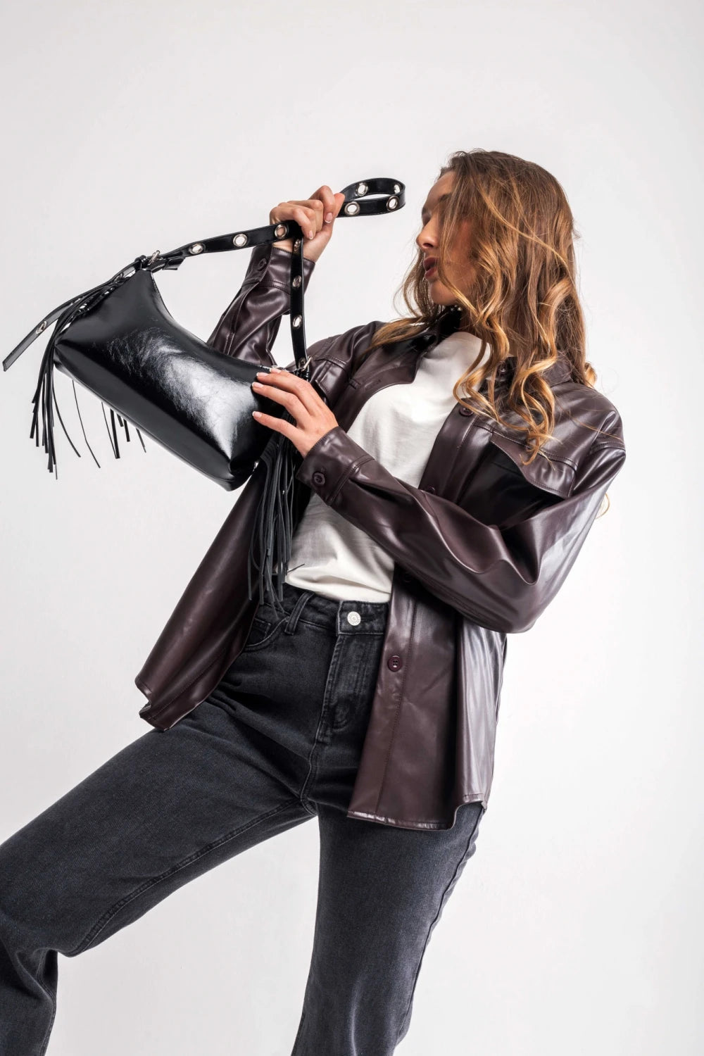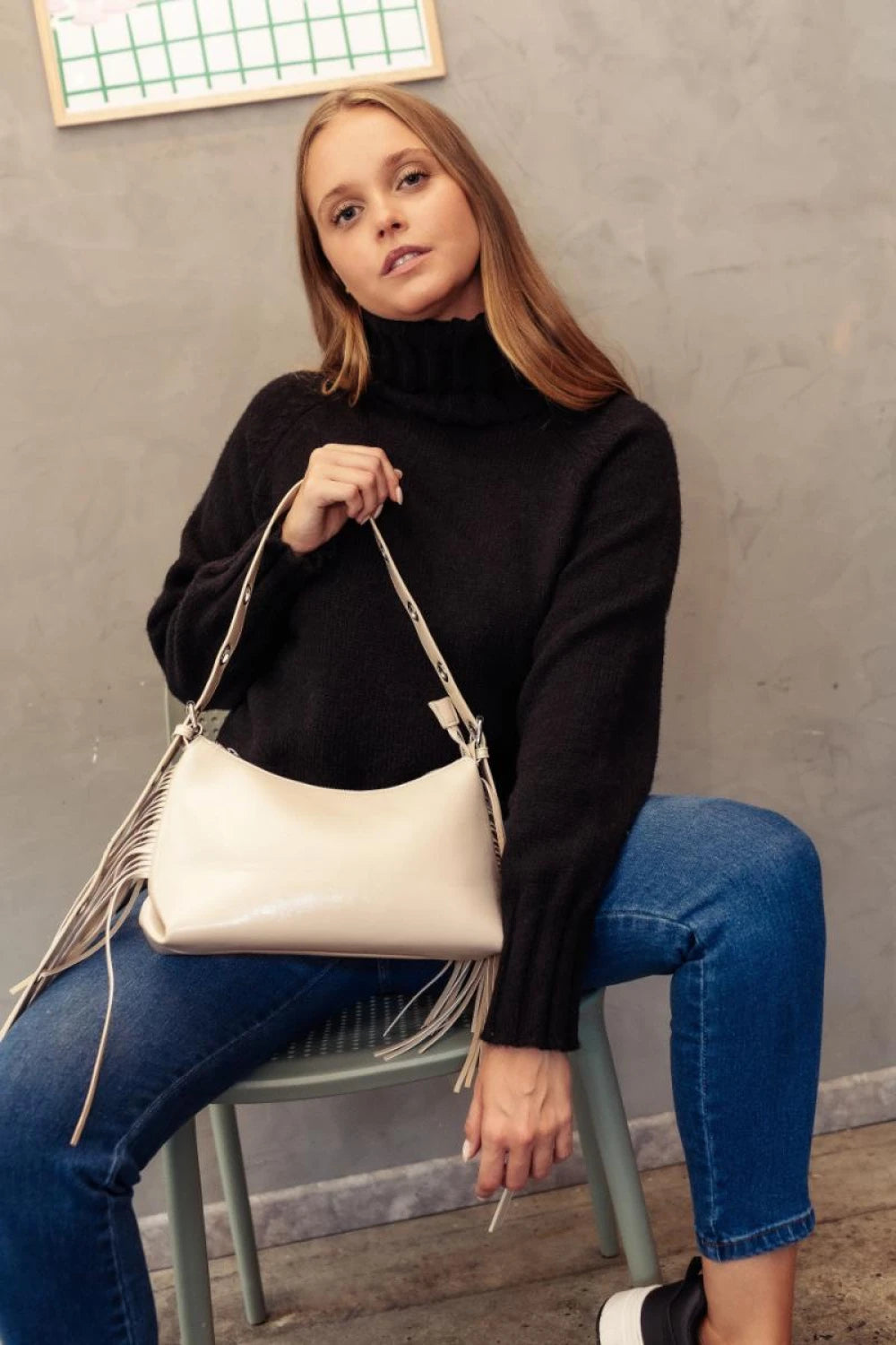Baguette de diseño con flecos laterales y correa con ojalillos que suma actitud a cualquier look. Formato compacto pero rendidor: entra celular, billetera pequeña, llaves y make-up básico. Exterior en simil cuero fácil de limpiar, cierre superior con deslizamiento suave y forrería textil. Herrajes metálicos, costuras reforzadas y caída suave que estiliza al llevarla al hombro.