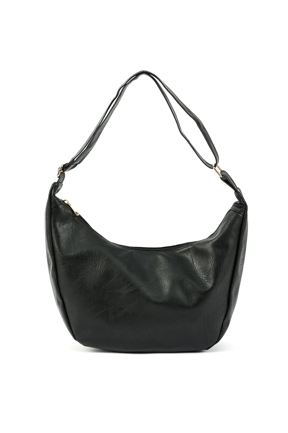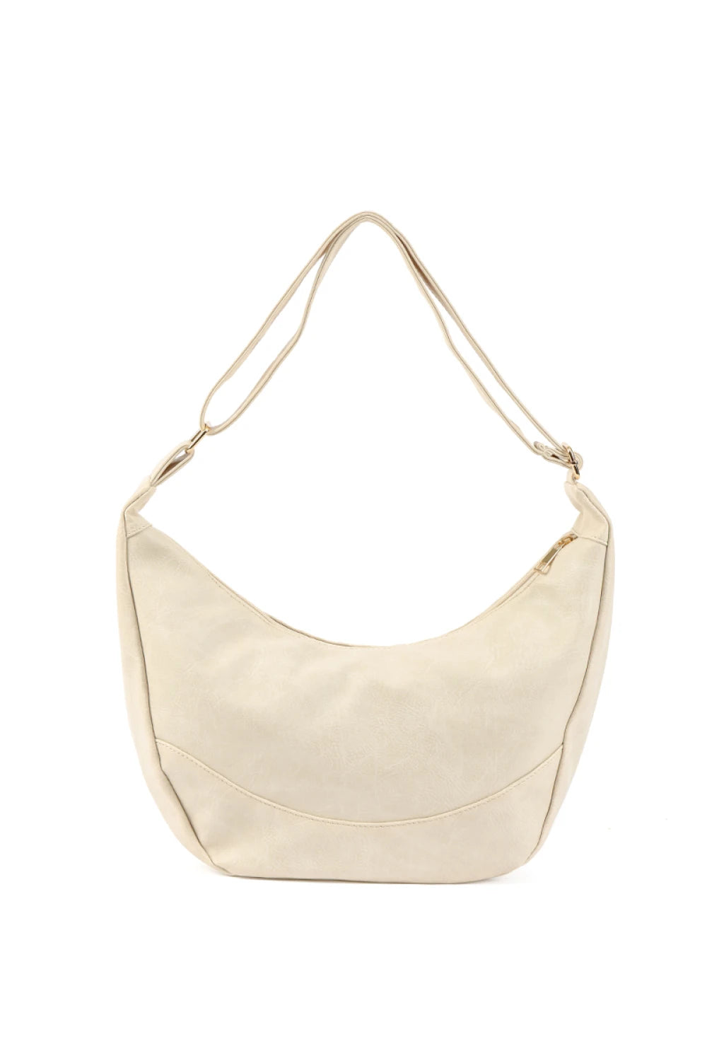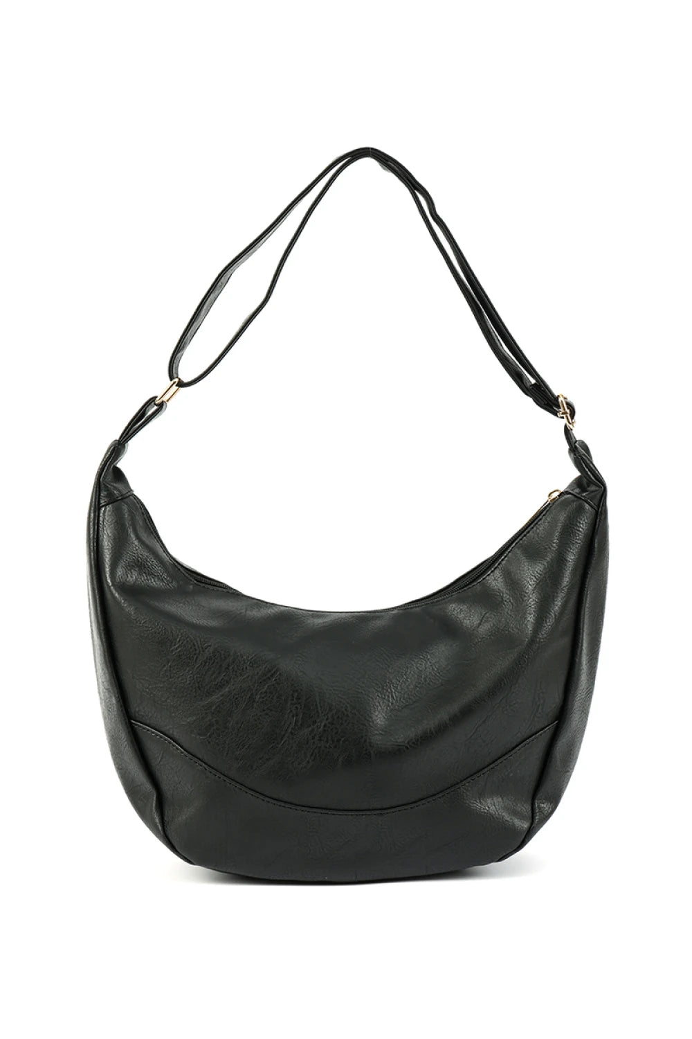 Hobo de silueta media luna en simil cuero suave, liviano y flexible. Lleva correa al hombro regulable y cierre superior seguro. Interior forrado con bolsillo para organizar lo esencial: celular, billetera, llaves y make-up. Caída cómoda que se adapta al cuerpo y look minimal que combina con todo (día o noche).